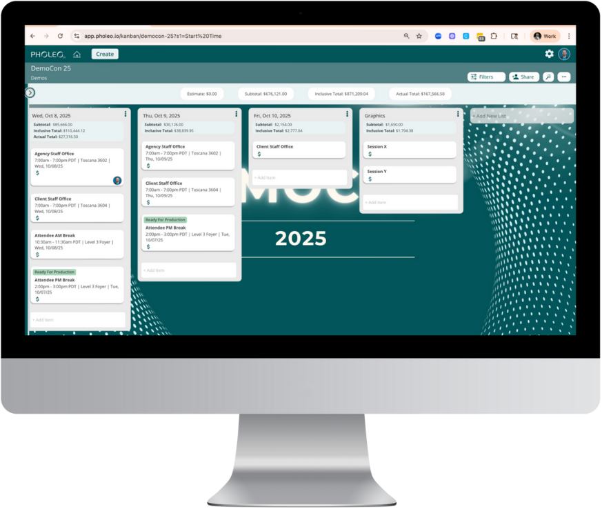 Spin up a Pholeo (your live program space) with our guided builder—inventory, locations, and services populate as you go, then collaborate in real time across venues, suppliers, and workstreams. The result is a spec-ready workspace your whole team can trust from day one.